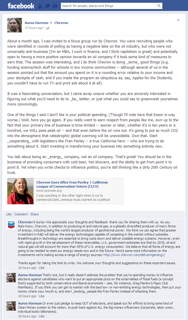 Auros read our story about Chevron funding political attacks on environmental champions like State Senator Fran Pavley. Then he shared his thoughts (and a link back to the CLCV blog) on Chevron's official Facebook page. Chevron replied with a comment just a few hours later. Check it out on Facebook, and add your comments!